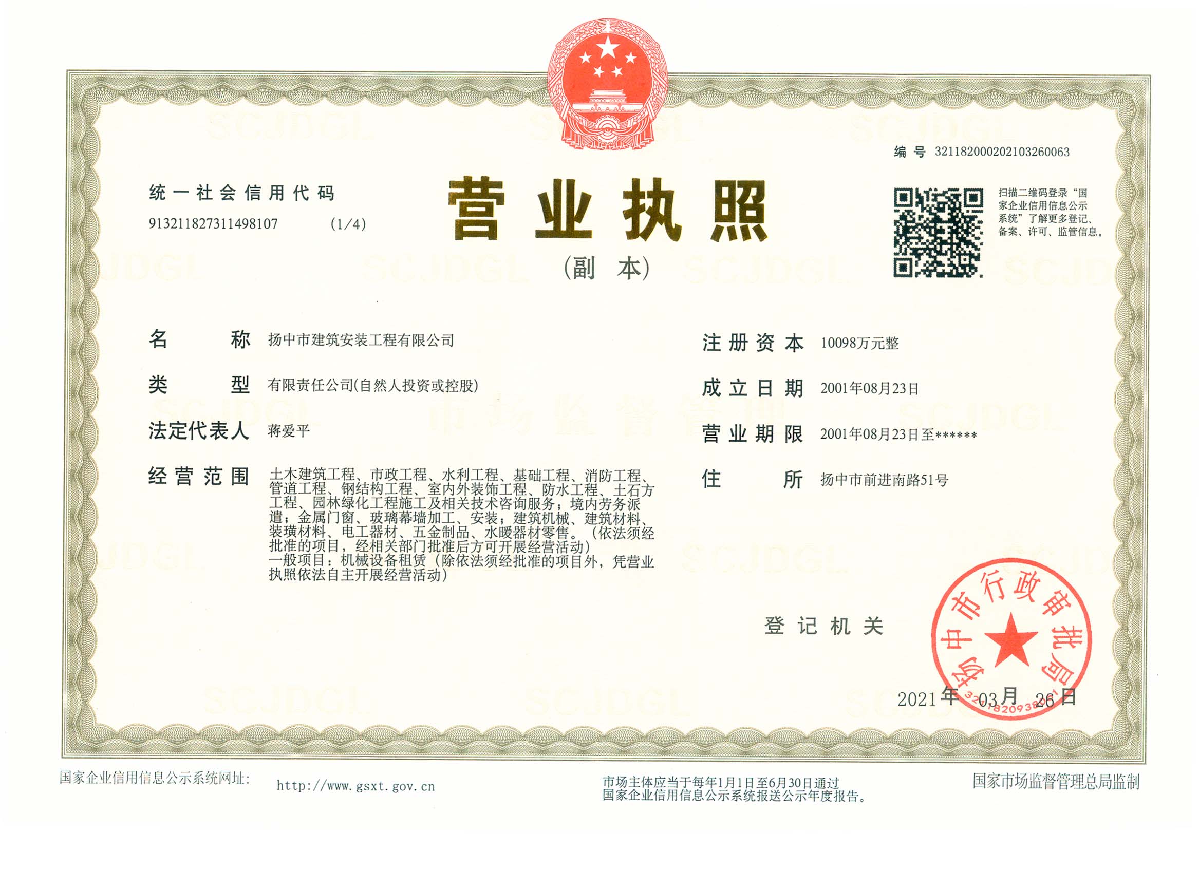揚(yáng)中市建筑安裝工程有限公司是房屋建筑工程施工總承包國(guó)家一級(jí)和市政公用工程施工總承包國(guó)家一級(jí)資質(zhì)施工企業(yè),并具有地基基礎(chǔ)工程專業(yè)承包、起重設(shè)備安裝工程專業(yè)承包、建筑裝修裝飾工程專業(yè)承包、消防設(shè)施工程專業(yè)承包、建筑機(jī)電安裝工程專業(yè)承包、鋼結(jié)構(gòu)工程專業(yè)承包等資質(zhì),在上海、南京、鎮(zhèn)江、蘇州、常州、沭陽(yáng)、蕪湖、湖北襄陽(yáng)等地設(shè)有分公司。60多年來(lái),公司承建了一大批工業(yè)與民用建筑,為地方經(jīng)濟(jì)和...